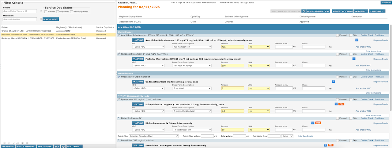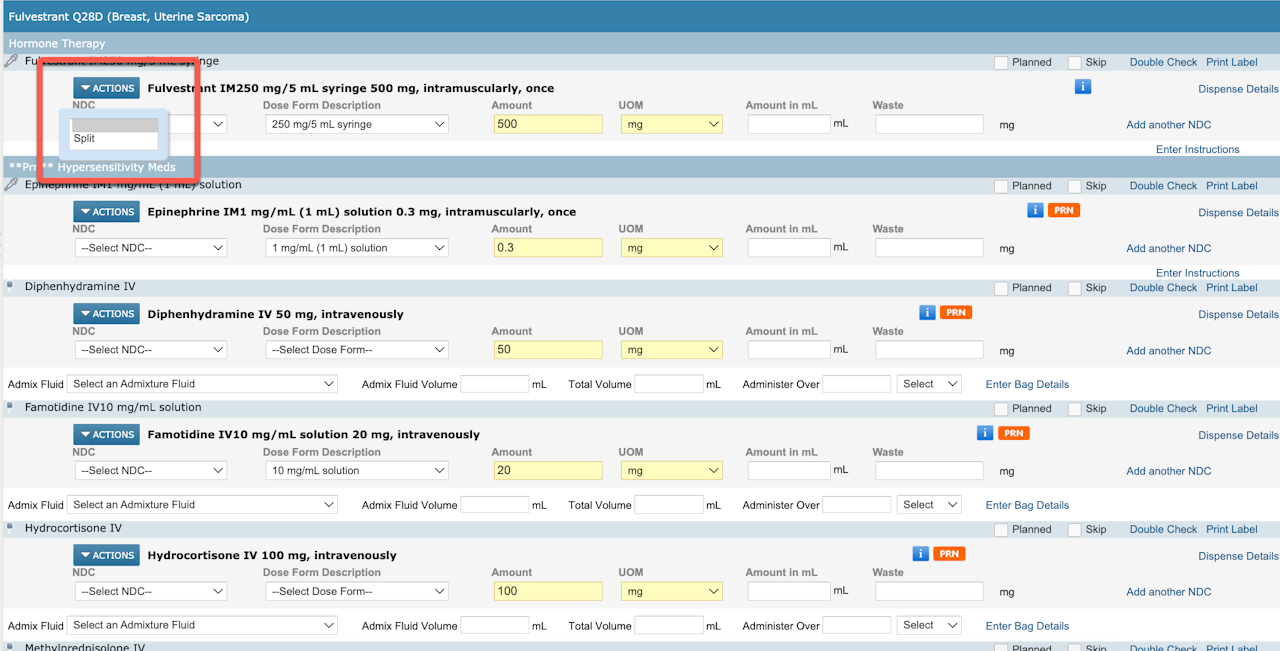 Click the ACTIONS button next to the medication dose and select Split from the drop-down menu. The dose will split into two separate lines.