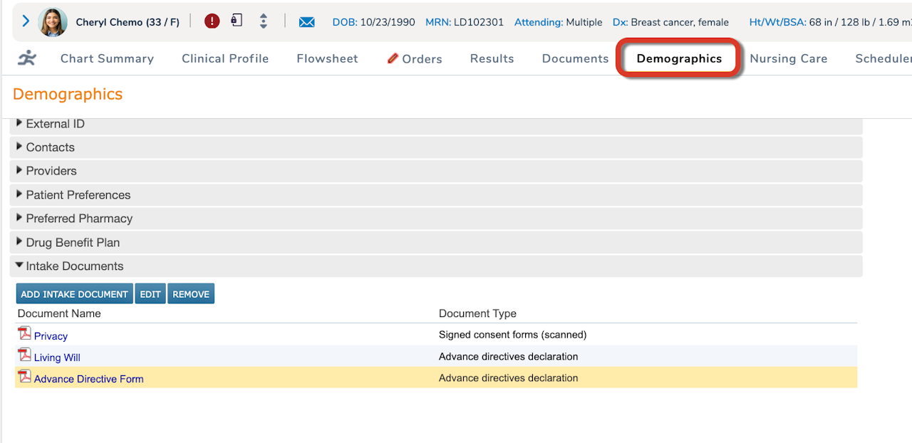 The Demographics chart tab includes information like Previous name, Patient Preferences, Patient Status, Insurance Information and Intake Documents.