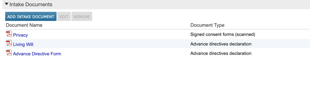 Intake Documents are forms completed by a patient, such as medical history and HIPAA consent forms.