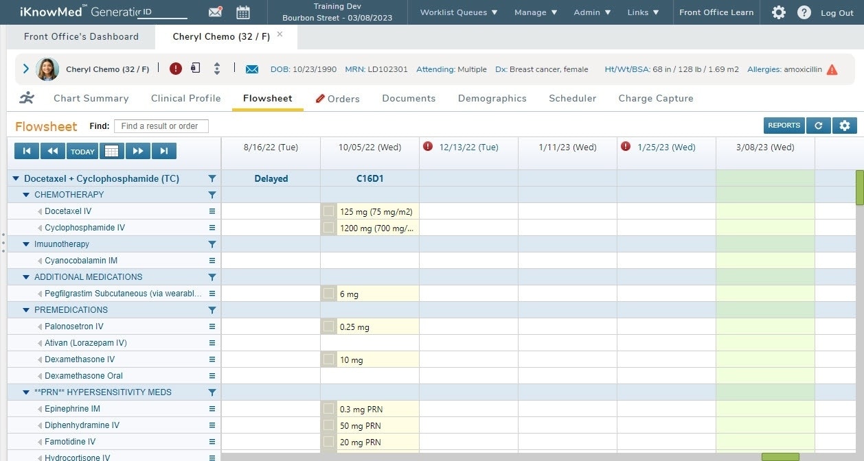 The Flowsheet displays clinical information chronologically, including Regimens, Medications, Orders, Results, Vitals, Supplies, and more.
