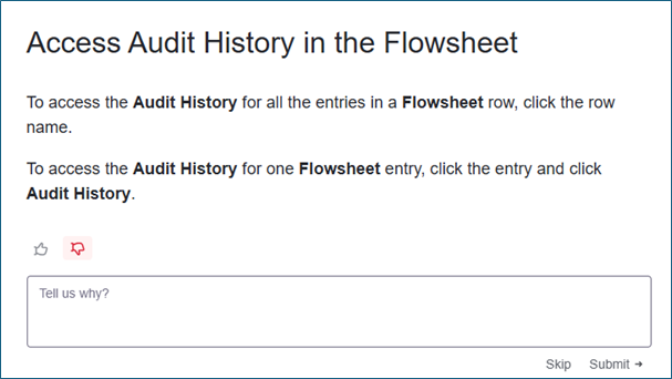 You will now see thumbs up and thumbs down icons after every step in a guide. If you like the content, give it a thumbs up to let us know. If we can improve it, give it a thumbs down, Tell us why in the field that appears, and click Submit.